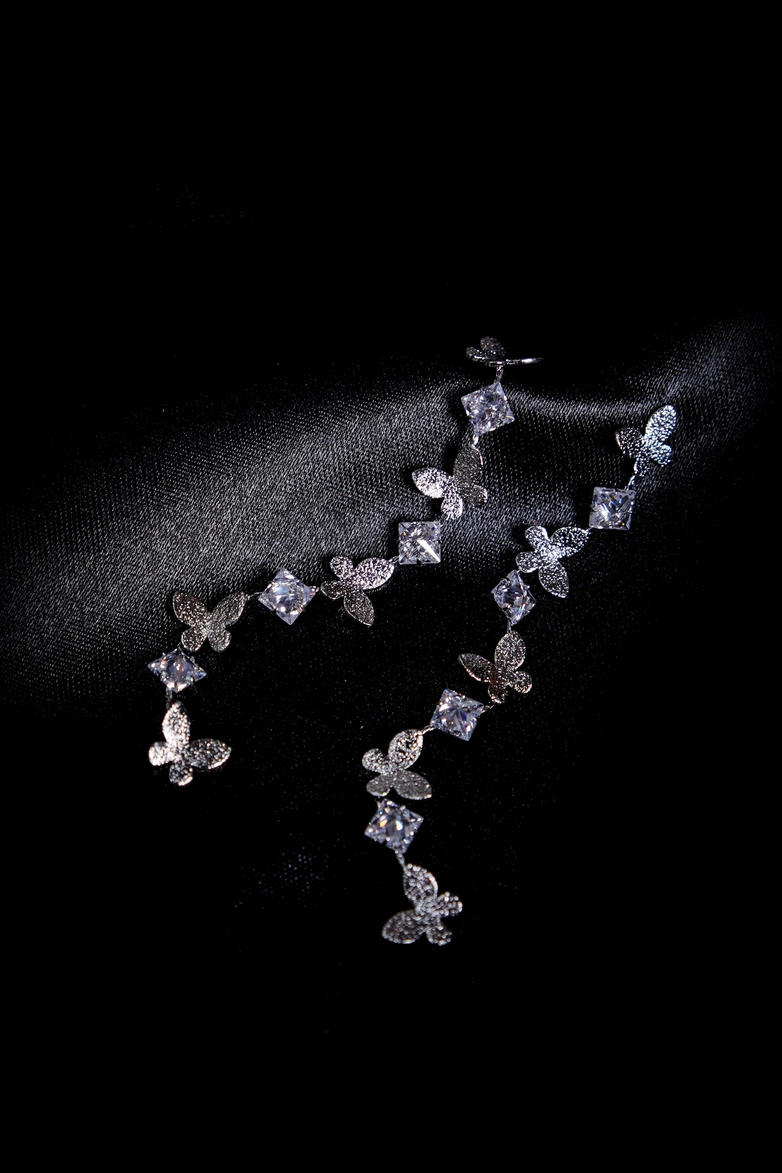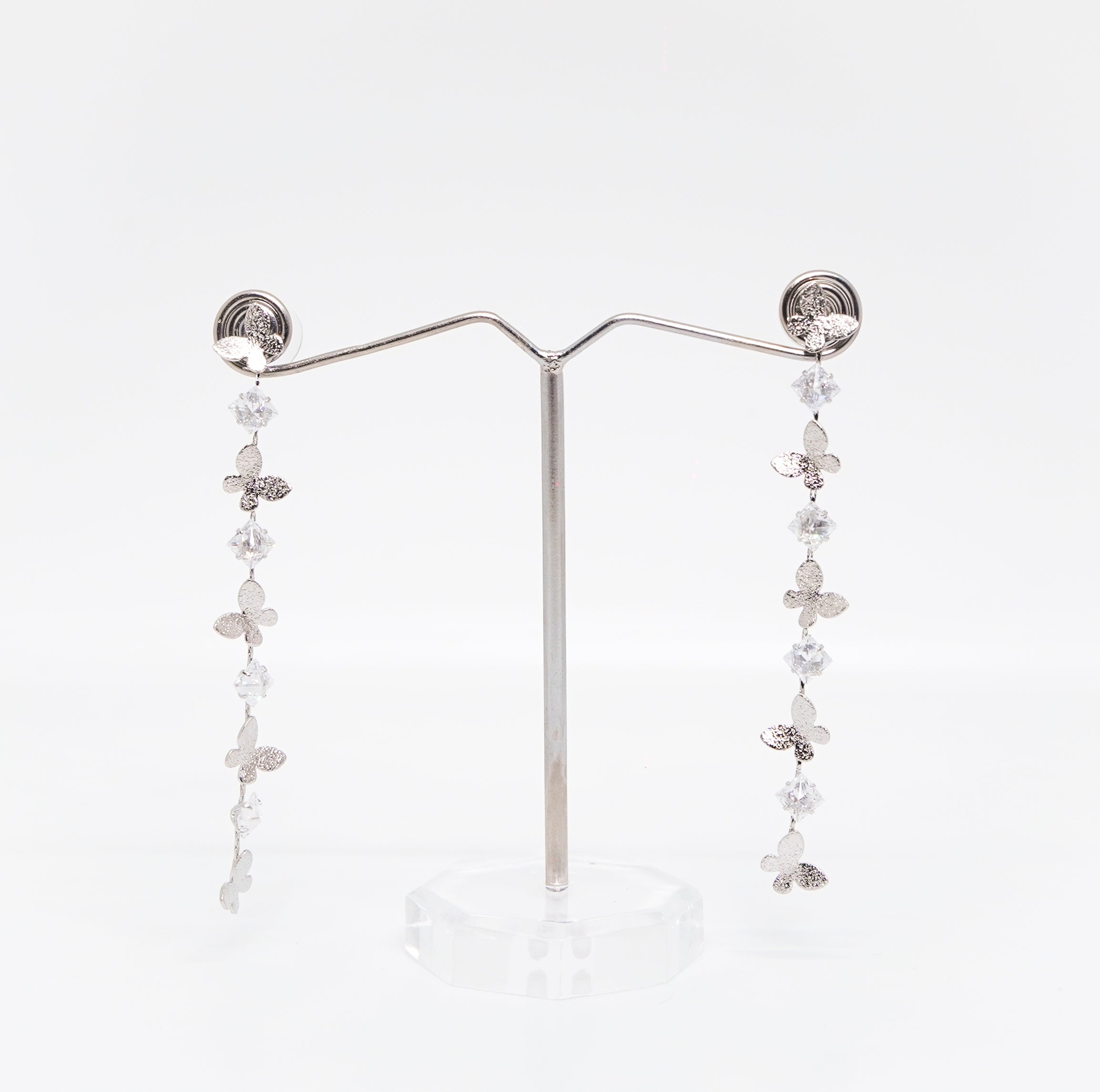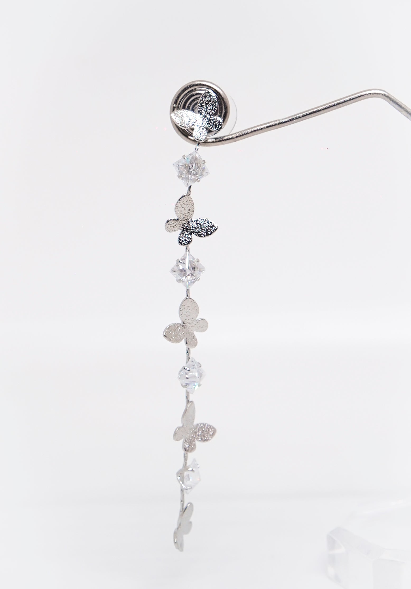 Style:This long,elegant drop earrings feature a delicate chain design with alternating butterfly motives and sparkling,faceted stones.These earrings finished in a silver tone metal.