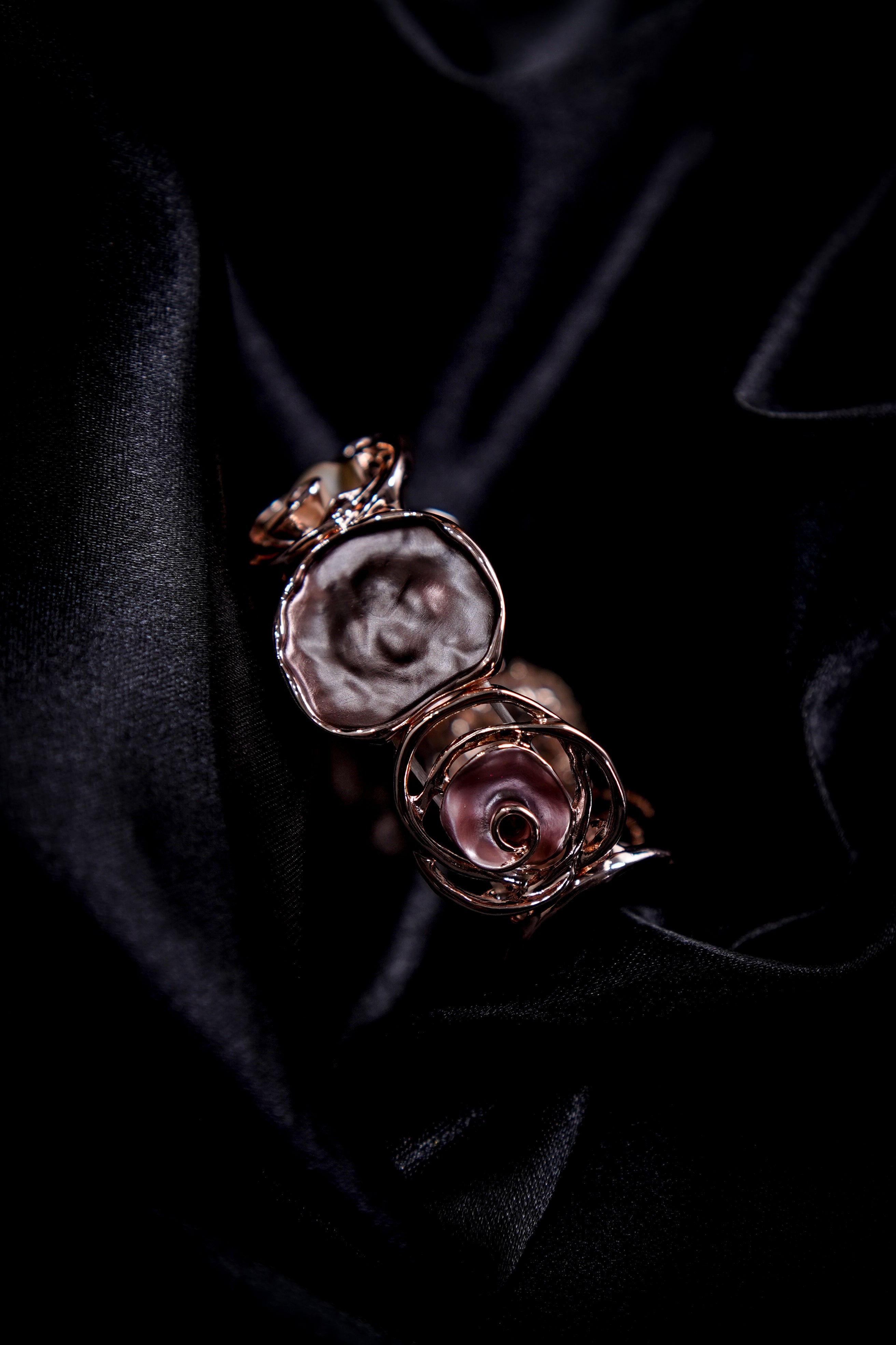 Rose gold toned, hollowed-out alloy bracelet with floral and shell motifs.