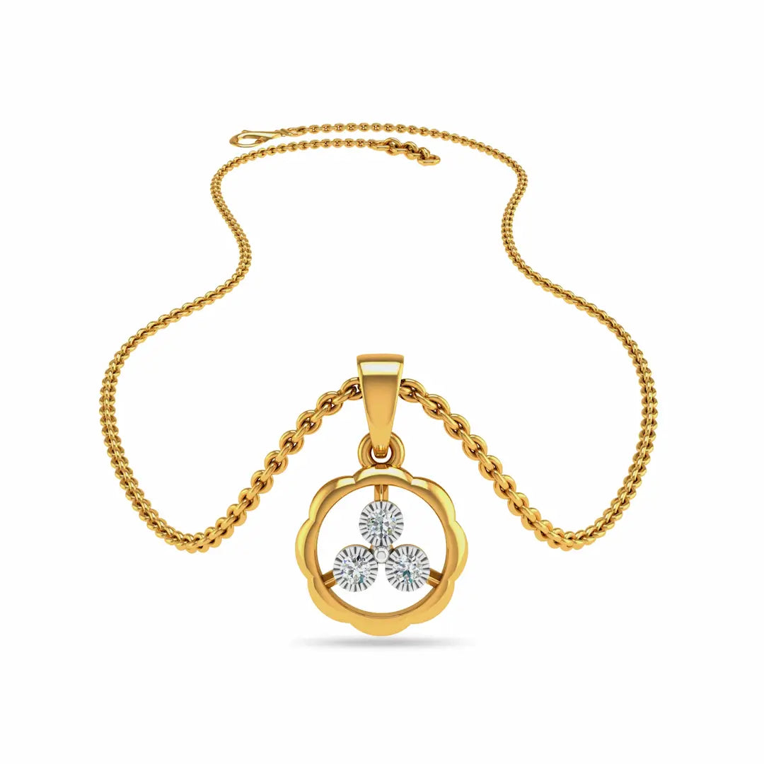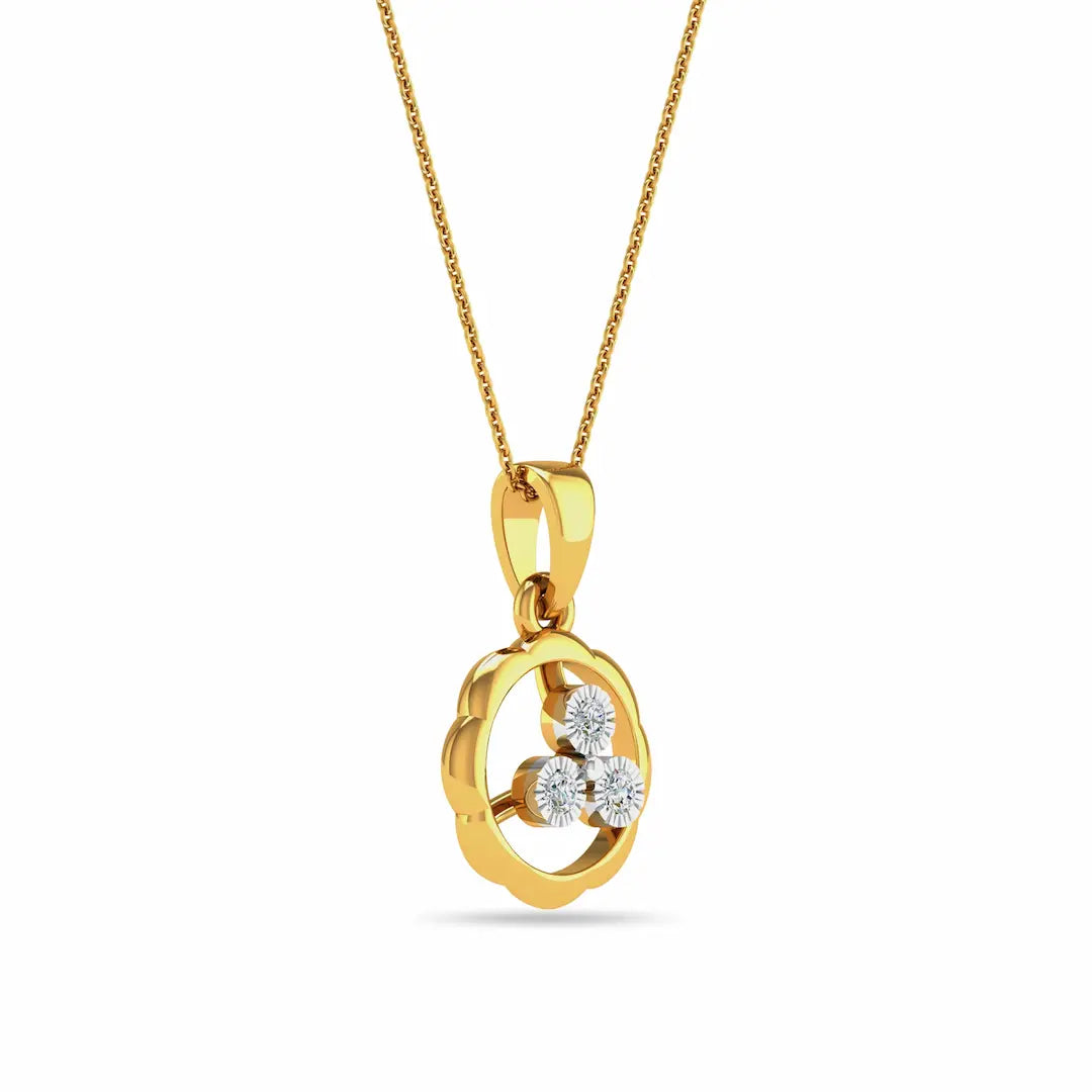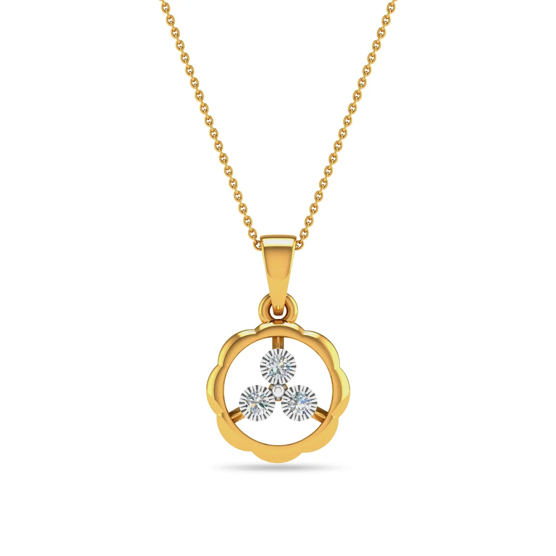 This pendant is beautifully fashioned from radiant 18K yellow gold, featuring a delicate geometric design accented by sparkling 3 natural diamonds. Diamonds exhibit excellent clarity and colour, creating a captivating shimmer that catches the light with every movement.