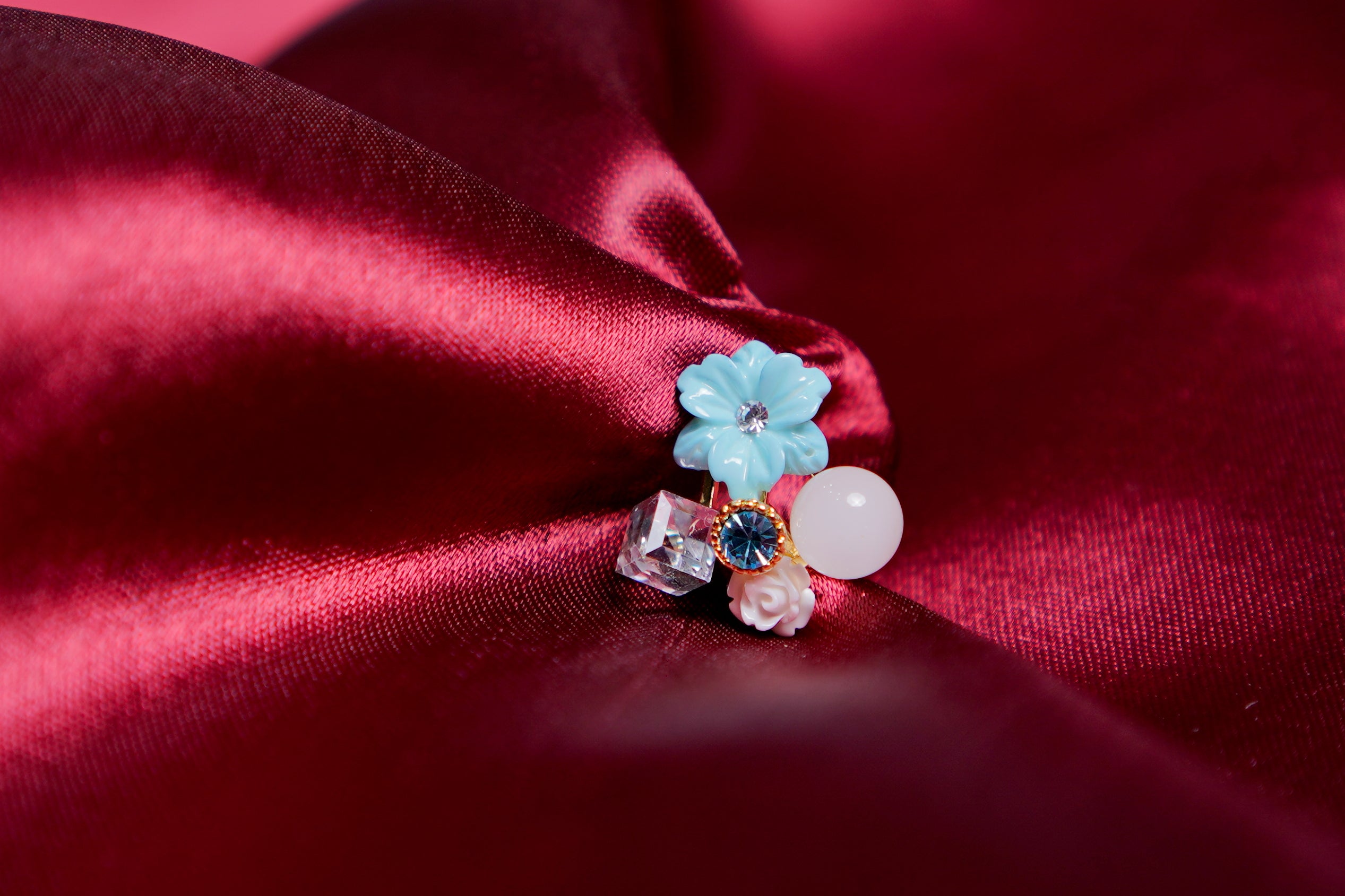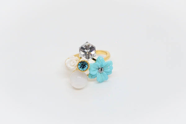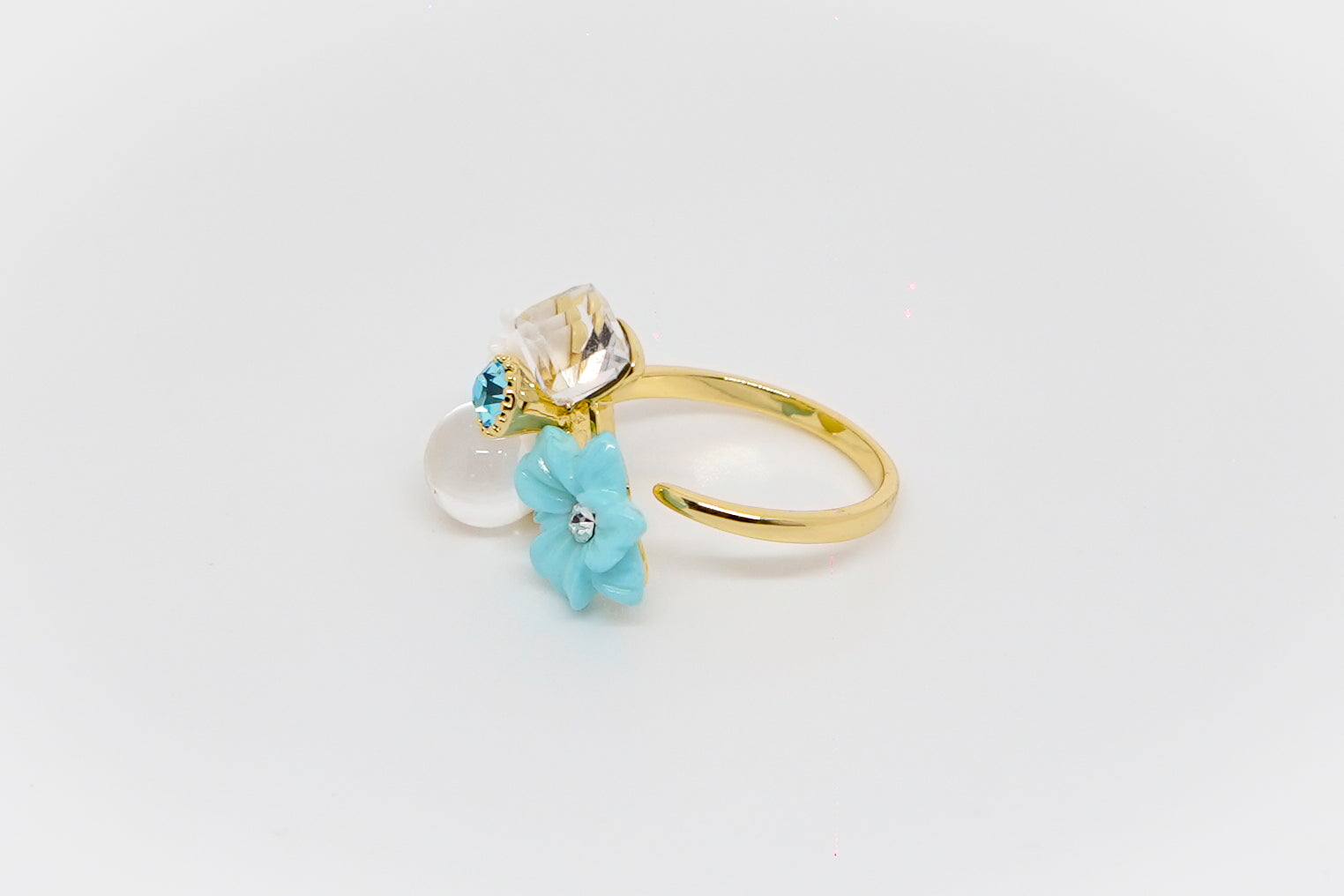 - Design: A unique cluster of decorative elements, including a large, faceted clear stone, a smooth white stone, a small blue crystal, a delicate white rose, and a light blue flower.