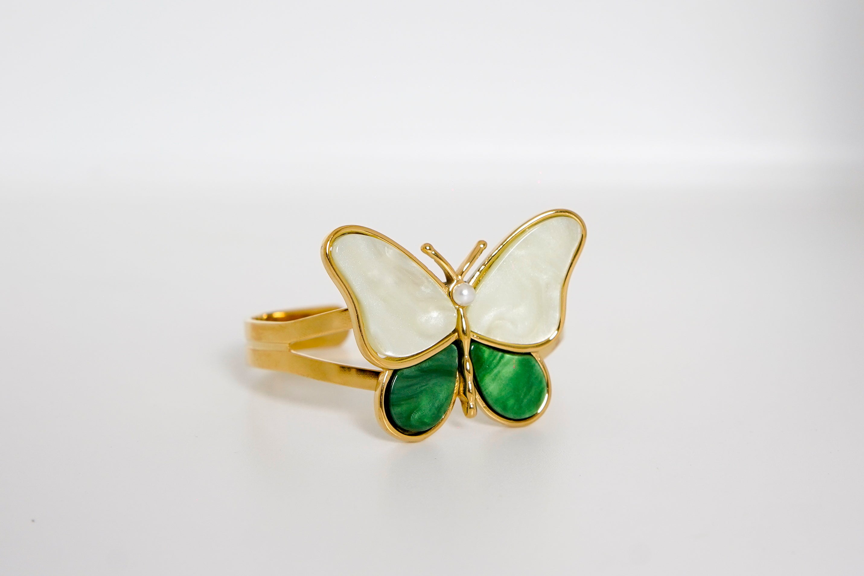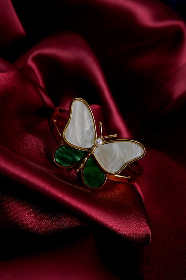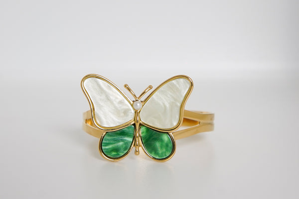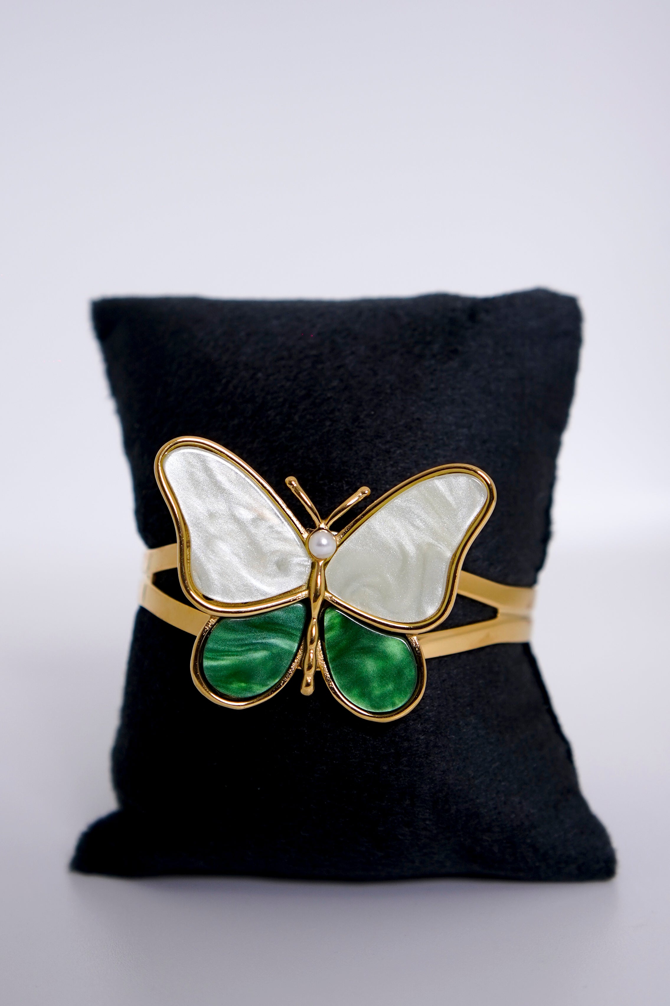 • Design: This elegant, adjustable cuff-style bracelet features a butterfly with a gold-toned body. The upper wings are crafted from a pearlescent white material, possibly mother-of-pearl or enamel, with a small pearl accent at the center. The lower wings are a vibrant green, possibly enamel or jade, giving the piece a luxurious and colorful contrast.