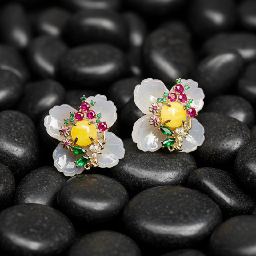 - Gemstones: Each earring showcases a prominent, smooth, yellow central stone, surrounded by white or translucent petals.
