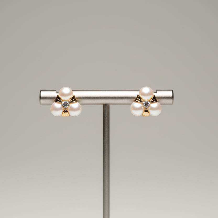 - Design: Each earring is composed of three white, round or button-shaped pearls arranged in a triangular or clover-like cluster. At the center of the three pearls, there appears to be a small, clear stone, likely a crystal or diamond accent.
