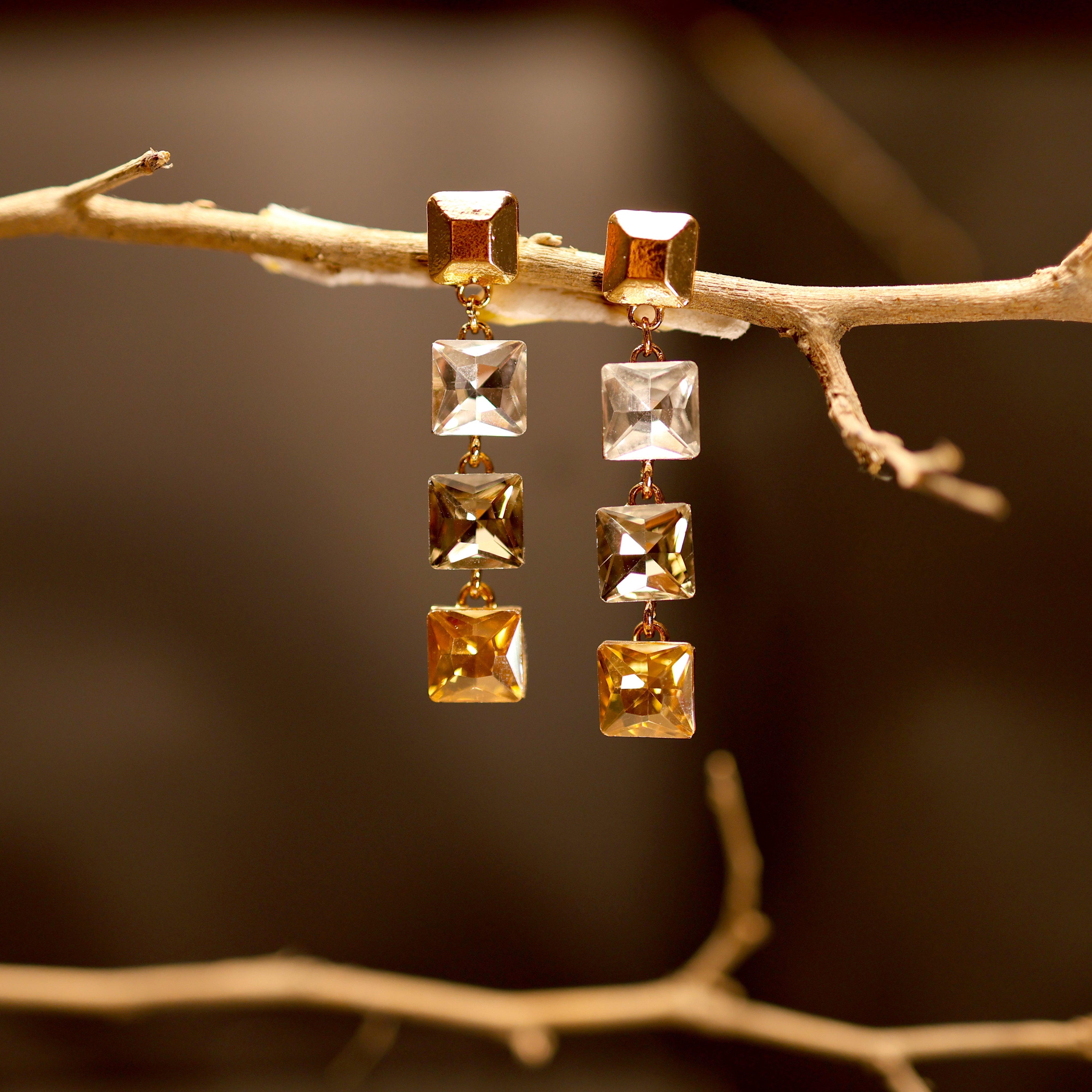 • Design: Each earring features three square crystals suspended vertically. The top crystal is clear/white, the middle and bottom crystals are a warm amber or light brown tone.