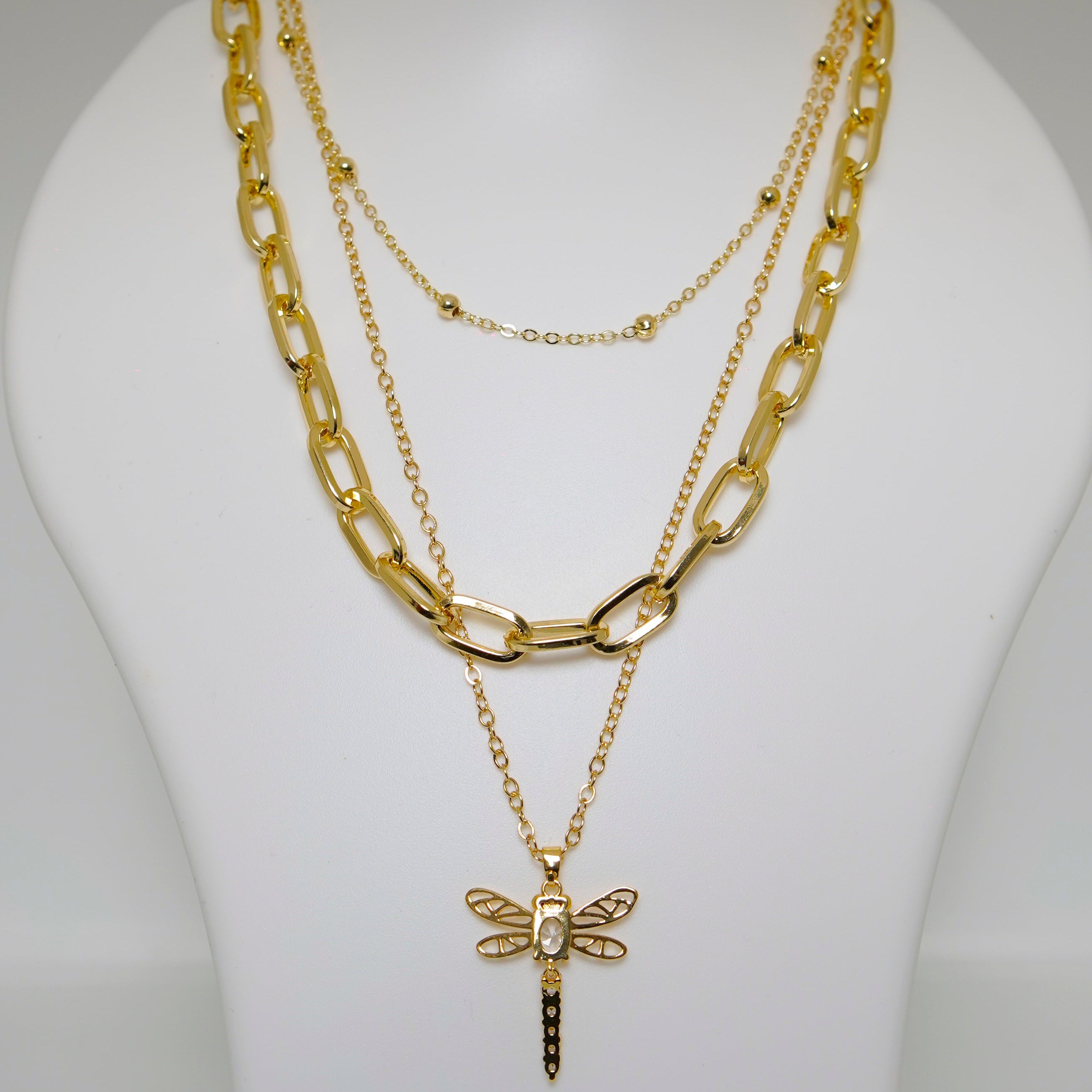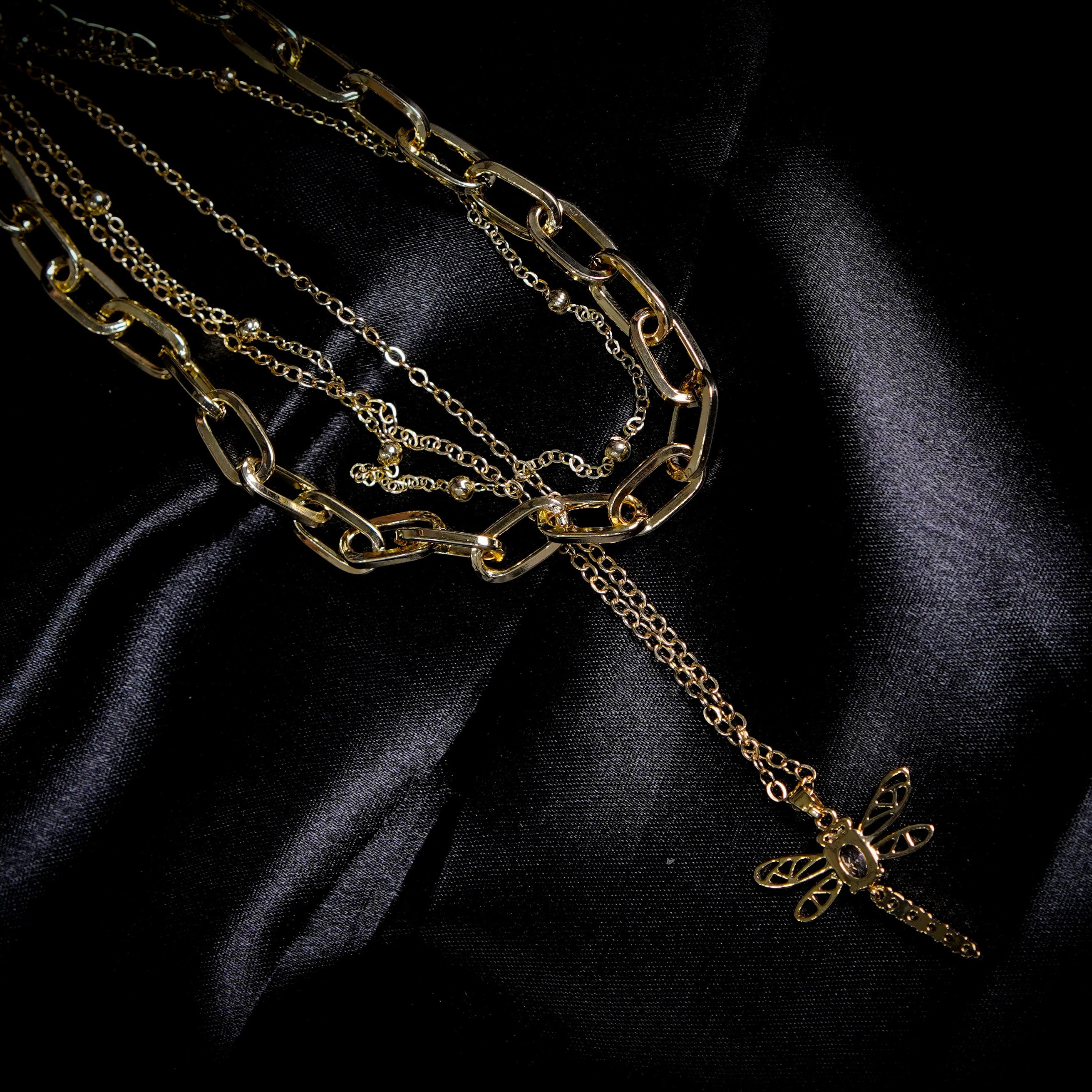 This is a multi-layered gold-toned necklace featuring a dragonfly pendant. The necklace consists of three separate chains that create a layered look. The top chain is a delicate beaded chain, the middle is a chunky oval-link chain, and the bottom chain holds a detailed dragonfly pendant with a small, central stone.