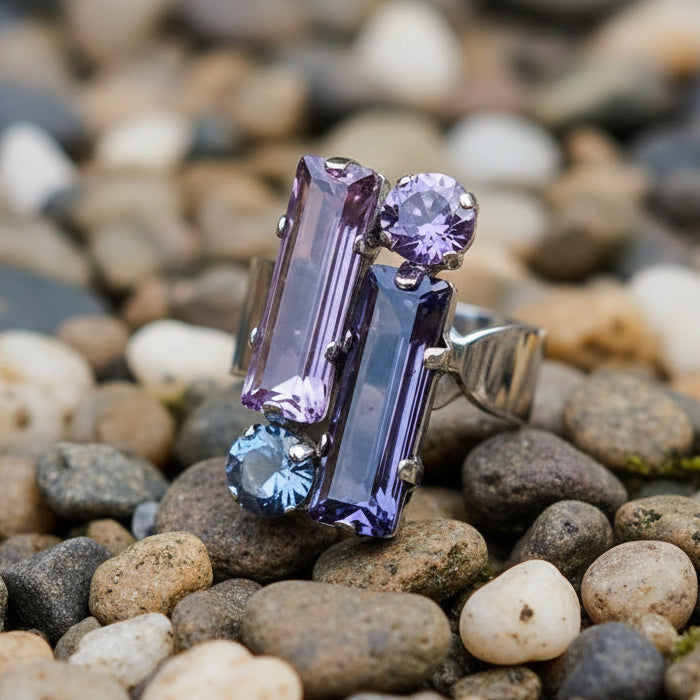 - Stones: Assorted baguette and round-cut crystals in shades of violet, lavender, and light blue.